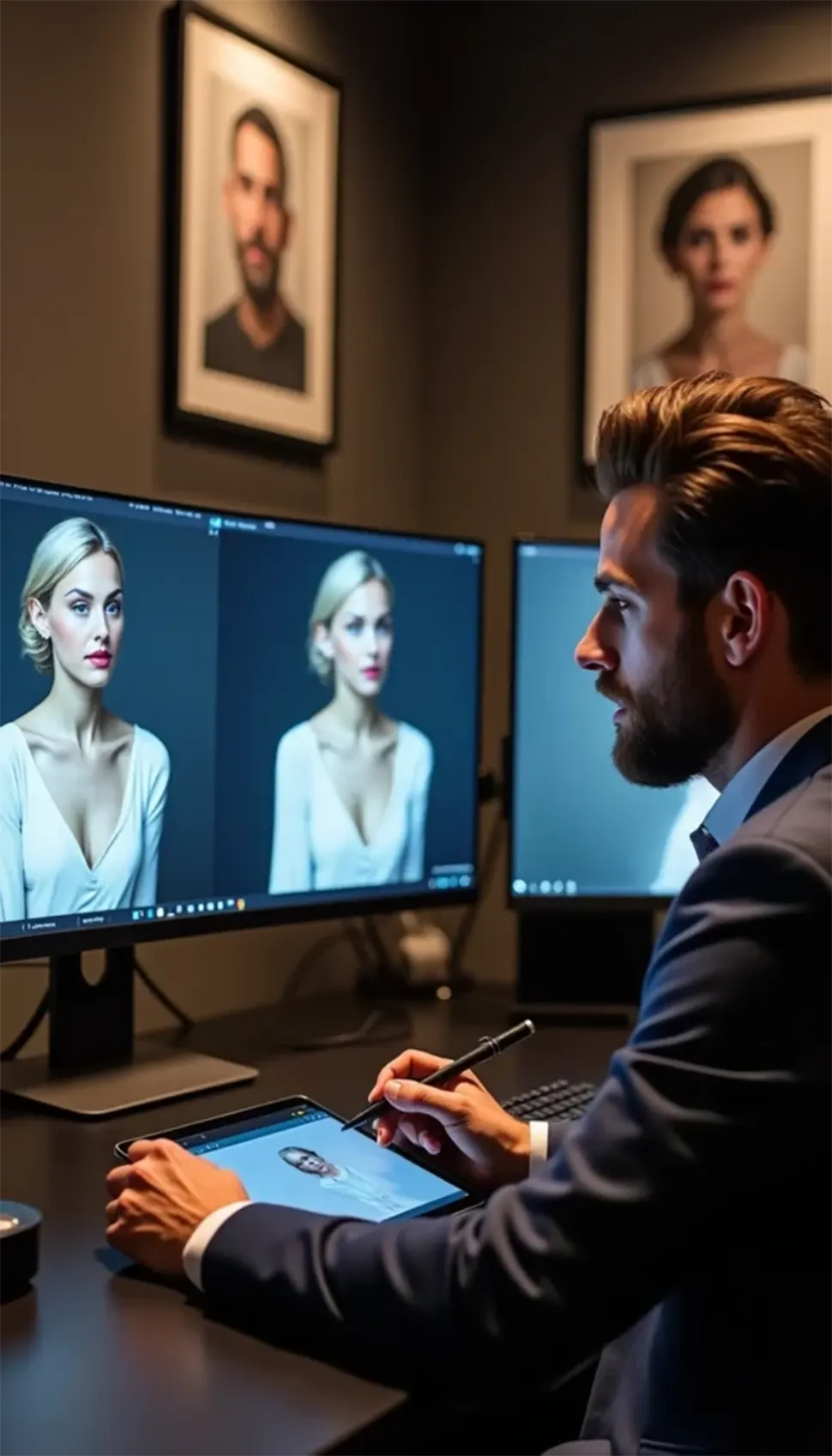 Photoshop reste l’outil de référence pour la retouche avancée de portraits. Des techniques comme le frequency separation permettent de traiter séparément la texture et les tons de la peau, offrant un contrôle précis sur la retouche. Le dodge and burn est utilisé pour sculpter subtilement les contours du visage et accentuer les traits.